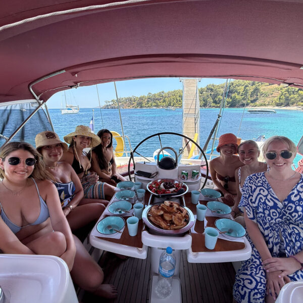 At one of our swimming spots, we’ll pause for lunch on board. Enjoy a fresh Greek salad made with our own olive oil, along with traditional Skopelos cheese and onion pie, and a selection of drinks. All options are vegetarian-friendly.